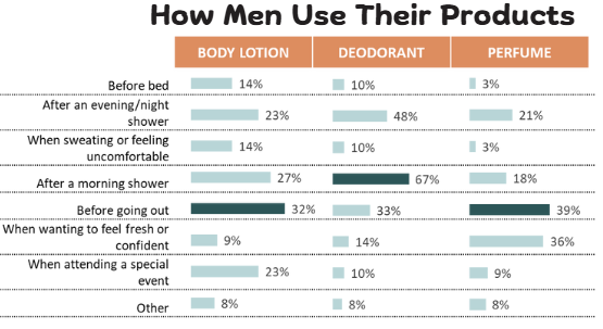 Looking into the usage moments, body lotion and perfume are typically perceived as more special products, which often used before going out. Whereas deodorant is viewed as a routine item, commonly applied after morning shower.