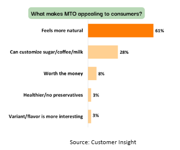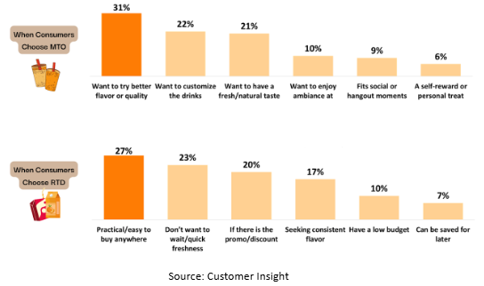 The behavior of MTO’s consumers reflects a broader desire for variety and novelty between MTO and RTD. While MTO offers freshness and customization, RTD provides convenience and quick access. Alternating between the two helps consumers balance excitement vs. practicality.