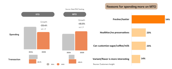 Their beverage choices are not exclusive, but complementary, driven by needs, occasion, and the need to keep experiences fresh. Consumers choose MTO when they want to try better quality, customize the drinks, and have a natural taste. If they want practicality and quick freshness, they will choose RTD.